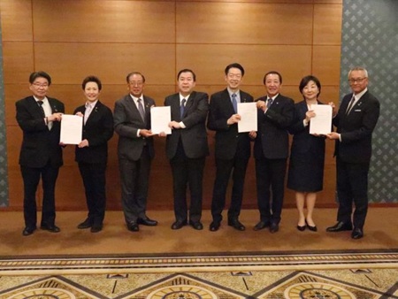 ▲左から成原副会長、若井敦子参議院議員、西脇副会長、棚橋泰文衆議院議員、武藤容治衆議院議員、戸部理事、野田聖子衆議院議員、宇佐美会長