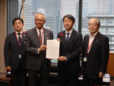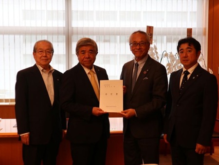 東海四県連合町村会(会長=宇佐美岐阜県町村会長)は、令和7年10月16日(木)、東京:全国町村会館において、棚野全国町村会長に、去る9月25日(木)に開催した東海四県町村会会長会議において採択された要望書を手渡し、要請を行いました。