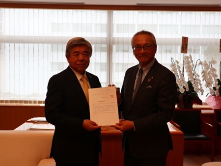 宇佐美岐阜県町村会長は、令和7年10月16日(木)、東京:全国町村会館において、棚野全国町村会長に、先の岐阜県町村会定期総会において採択された決議、令和8年度国の予算及び施策に関する要望書を手渡し、要請を行いました。